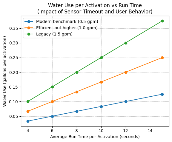 Graph assumptions Use only for early stage water modeling. Replace with measured usage and owner standards during DD and CD. 10 second average run time per activation. Traffic scenarios 250 to 2000 activations per day. Flow rates 0.5, 1.0, 1.5 gpm. N/A (derived from the article discussion)